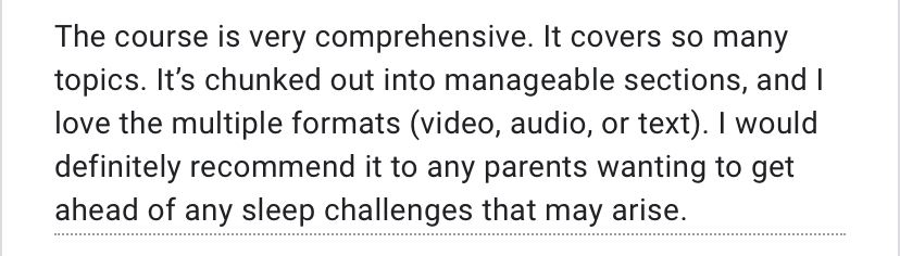 Given that I work holistically, I respect and understand that each family has a unique child and unique goals/needs. So, I can’t give an exact time BUT I will say that you will walk away with the knowledge and tools you need to start making changes as soon as you want to. Each lesson will bring insight and education that will lead you to better sleep.